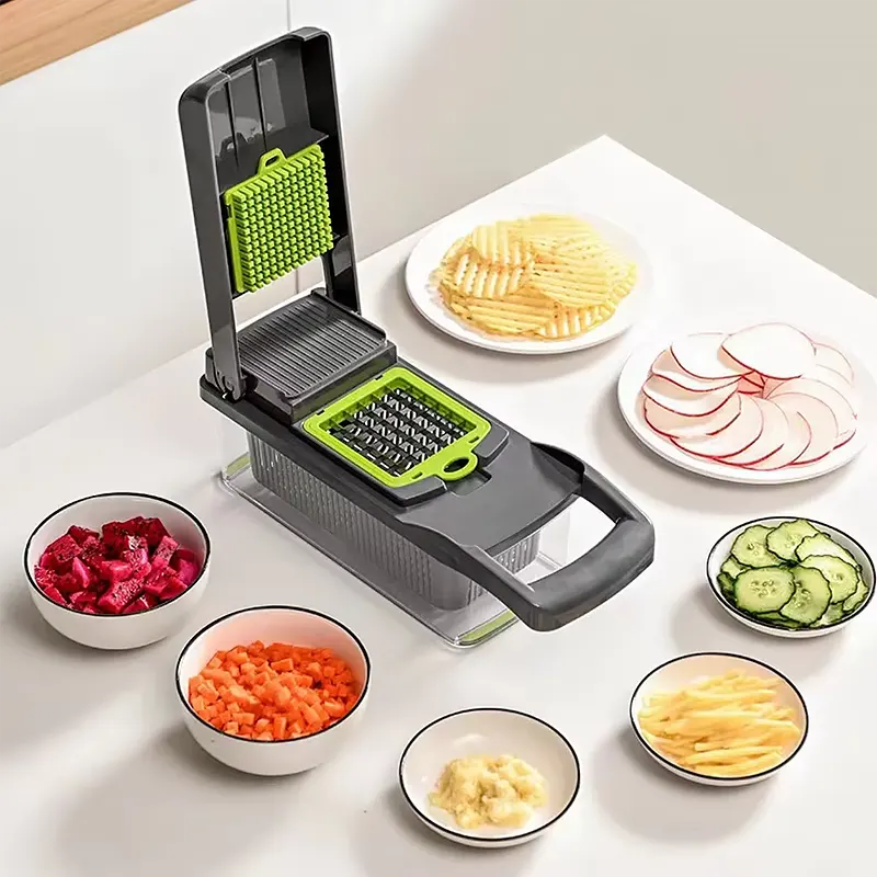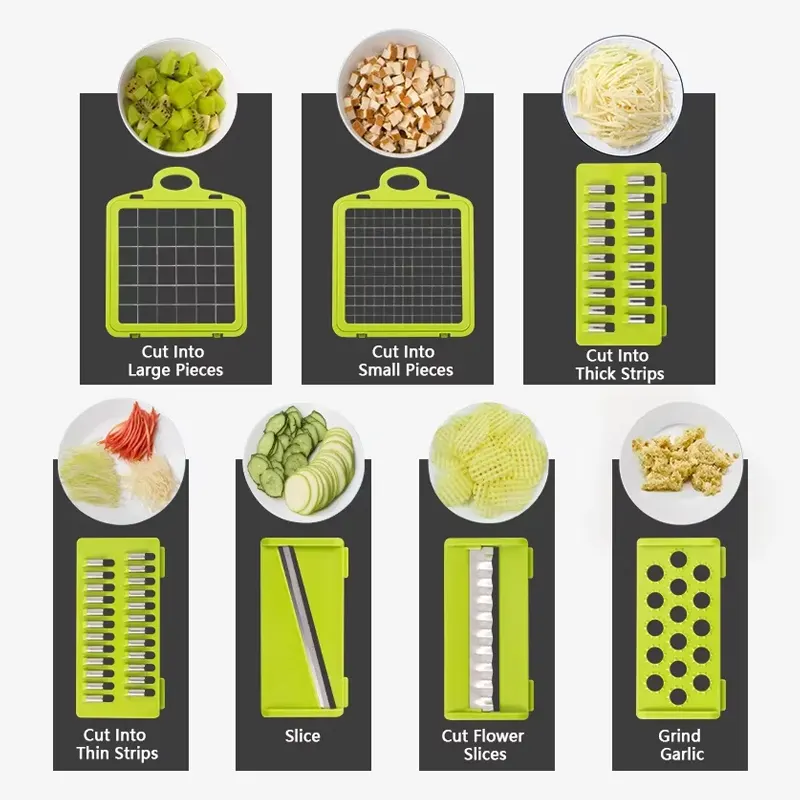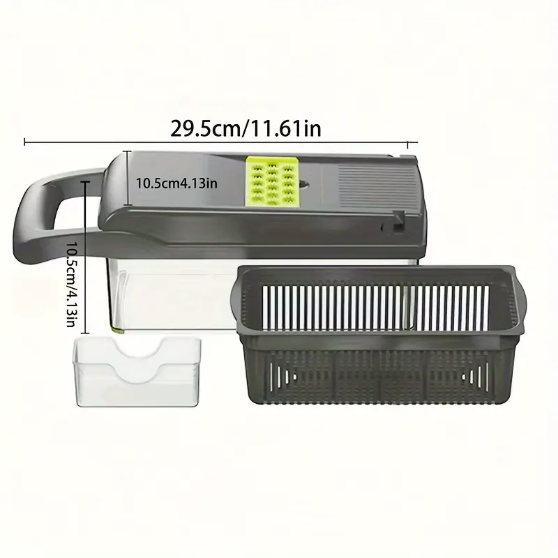 - Variedad de cortes: Las 7 hojas intercambiables te ofrecen diferentes opciones para cortar tus ingredientes de manera rápida y uniforme. Desde rebanar hasta rallar, podrás cortar cebolla, pepinos, zanahorias, papas, beterraga y muchos más alimentos con un solo accesorio.Cortes a tu gusto: Puedes optar por pedazos grandes para sopas o guisos, o pedazos pequeños para ensaladas, salsas o rellenos. Si prefieres las papas fritas caseras, las hojas permiten cortar las papas en tiras delgadas o gruesas, según tu preferencia.